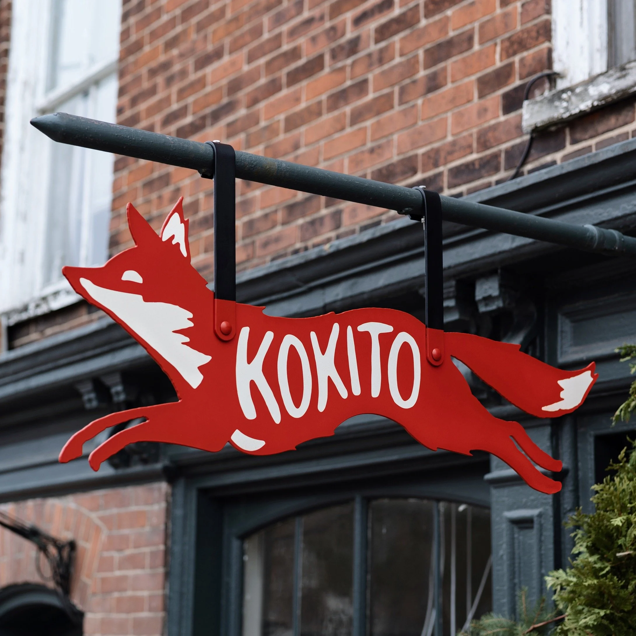 Flat coated aluminum sign with matching forged brackets for Kokito, in Bloomfied, PEC.