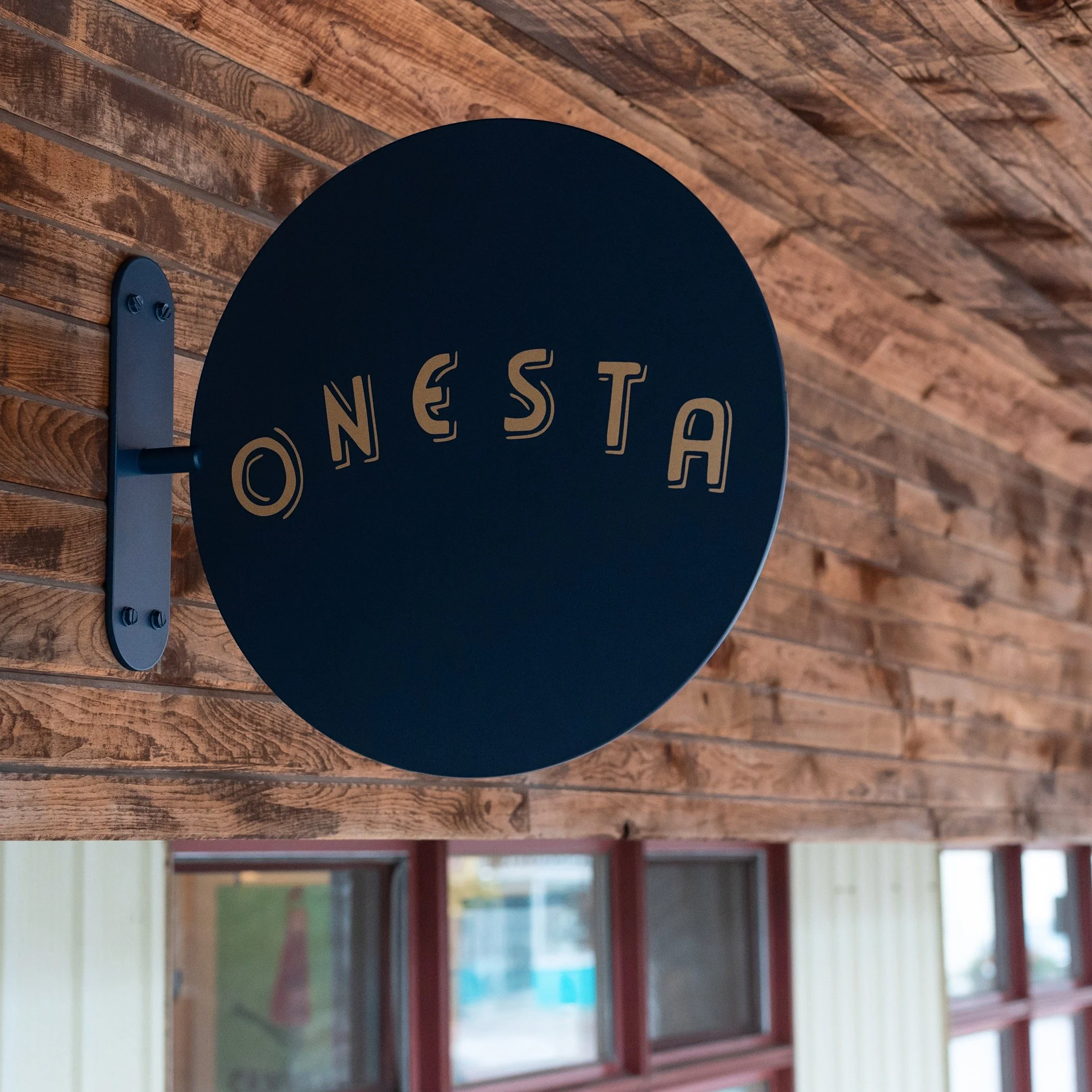 Flat blade sign with a powder coated logo for Onesta, in Picton, Prince Edward County.