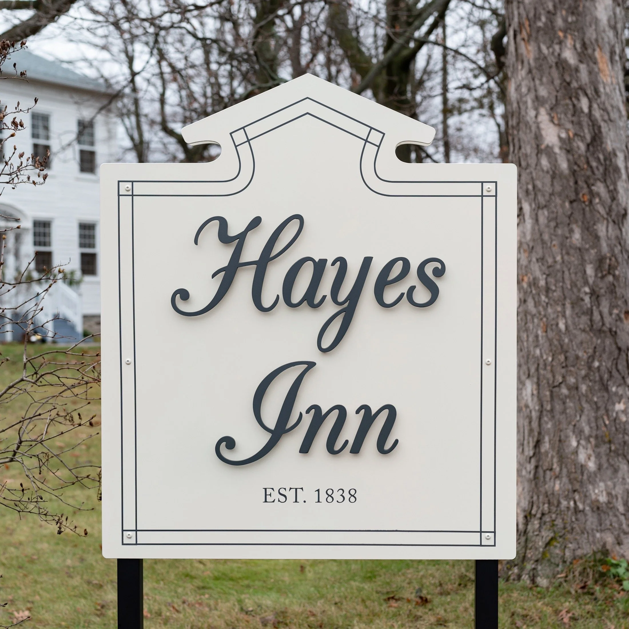 CNC cut stand-off letters on a backing with flat coated details. For Hayes Inn in Waupoos, PEC.