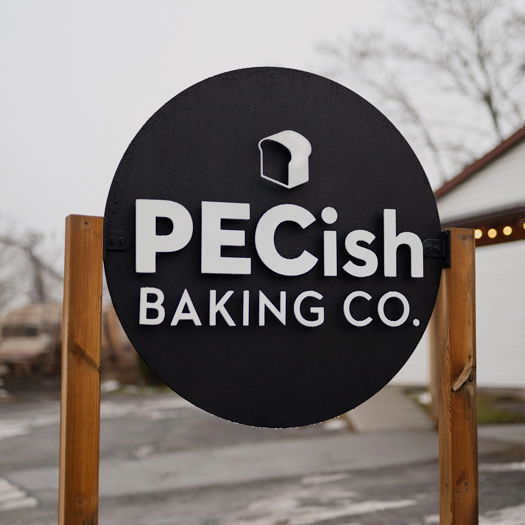 Aluminum business signage with 3 stage powder coating for PECish Baking Co., in Milford, PEC.