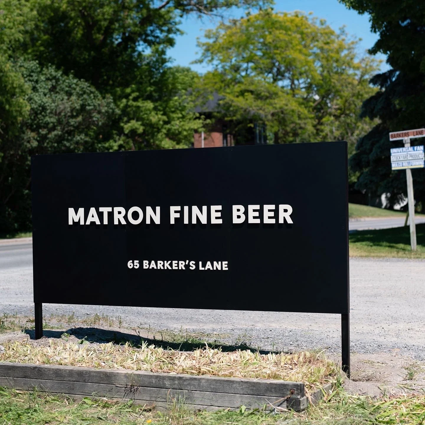 Stand-off CNC plasma cut logo and flush-mounted address, with a matte powder coat finish. Installed for Matron Fine Beer in Bloomfield, Ontario.